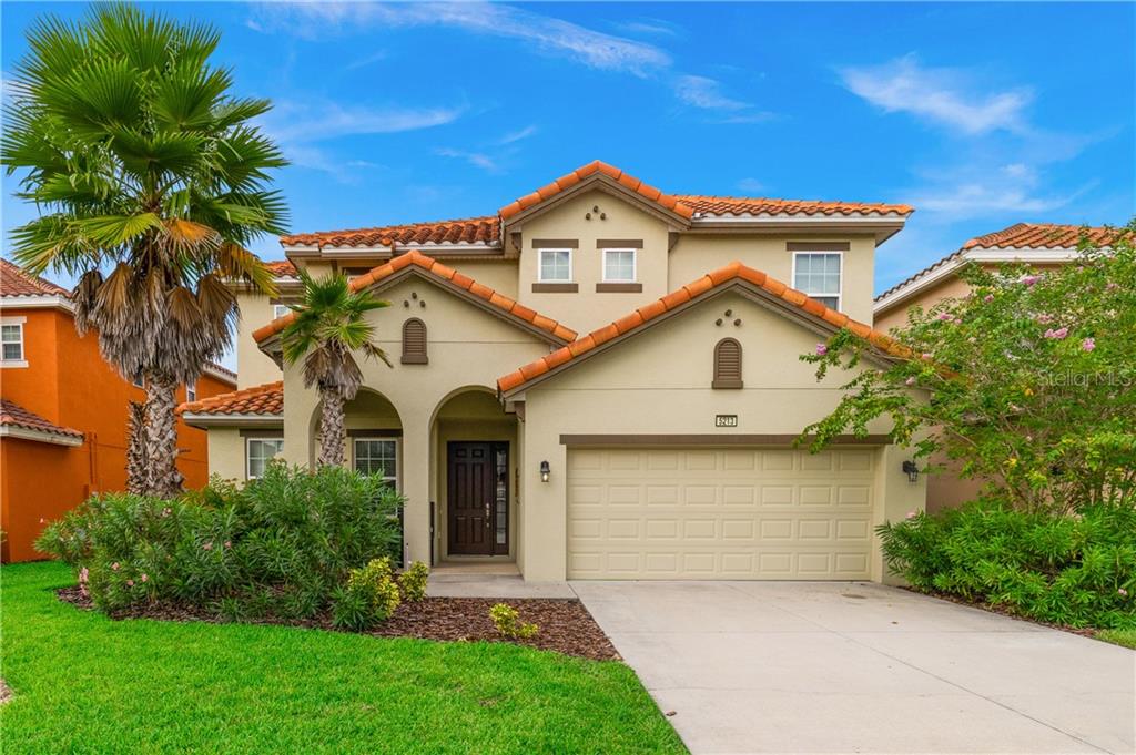 Beautiful fully furnished resort vacation pool home for immediate purchase. 6 large bedrooms and 5 baths. Turnkey ready with the great floor plan Coconut Palm by Park Square Homes. Great loft upstairs with game/media room & theme rooms. Granite kitchen/bathroom countertops, all kitchen appliances, laundry room, screened covered heated pool, covered lanai, and southwest facing pool. Professionally decorated furniture package including leather furniture. Gated entrances. The HOA fully maintains the lawns, common areas and kid-friendly areas. The clubhouse features a resort-style pool & lounge complex and a full exercise room/gym. Large pool with slides, tennis courts and pool cabanas. 15 minutes from Disney. Perfect for income generating short-term rental vacationers seeking what you will have – a secure, family-friendly resort experience. It can be your primary residence or your indulgent vacation home.
